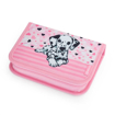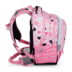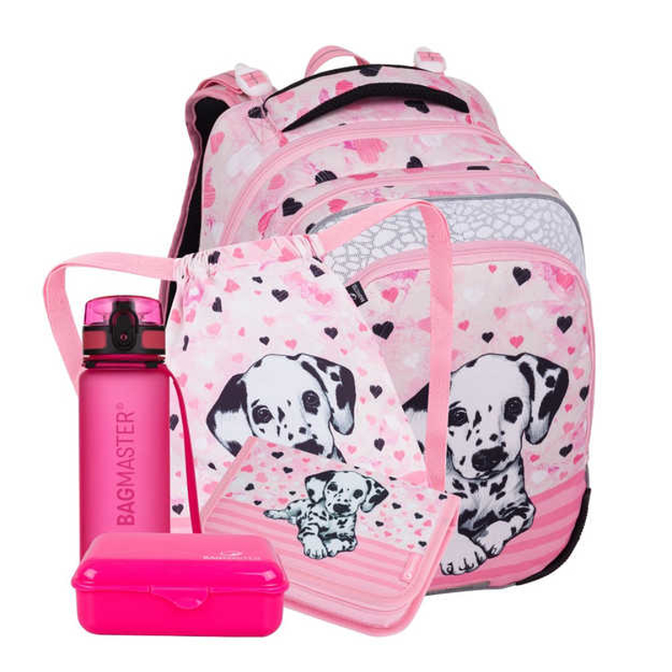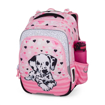 Batoh pro malé školačky od 1. do 3. třídy s dalmatinem. Zaujme nejen svým designem, ale také lehkostí – váží pouhých 0,98 kg. Uvnitř jsou tři velké komory a organizér na cennosti. Batoh s motivem dalmatina stojí na plastových nožkách, ve tmě chrání svými reflexními prvky. Zádový systém s hrudním pásem a bederním pásem má zdravotní posudek. K batohu bude školačce ladit penál na psací potřeby, látkový vak na přezůvky a svačinový set. SRDÍČKOVÝ SET S DALMATINEM OBSAHUJE tříkomorový super lehký batoh, jednokomorový penál se dvěma chlopněmi, školní látkový vak na přezůvky či úbor, krabičku na svačinu, láhev na pití s objemem 0,5 l s certifikátem nezávadnosti, vychytaný síťovaný sáček do batohu na klíče nebo na drobnosti s klíčenkou. Čím je školní batoh BETA speciální Je velmi lehký – váží jenom 0,94 kg. Má tři prostorné komory. Do hlavní se vejdou velké školní desky i učebnice a sešity formátu A4. V hlavní komoře je kompresní kapsa s elastickými postranními pásy na desky A4 a na velké učebnice. Pomáhá přitáhnout a udržet těžké pomůcky co nejvíce u zad, díky tomu má školák či školačka těžiště blízko páteře a při chůzi se nehrbí. V přední kapse je praktický organizér na mobil, tužky, sluchátka a peněženku. Na černou přezku v přední kapse můžete školačce připnout síťovaný sáček. Třeba na peníze nebo sluchátka. Do kapsičky na zip se vejde power banka. Nabíjecí kabel stačí otevřeným rožkem protáhnout k telefonu umístěnému v organizéru. Na bočních stranách jsou kapsy vhodné na láhev s pitím nebo třeba deštník. Ergonomicky tvarovaná záda a prodyšný bederní pás podporují správné držení těla. Flexibilní hrudní pás pomáhá stabilitě batohu na zádech. Ramenní popruhy díky němu nesjíždí z ramenou. Ramenní popruhy i zádový systém jsou měkce polstrované. Popruhy se nastavují pomocí horních a dolních plastových spon. Je třeba upravovat délku podle toho, jak školačka roste. Konce popruhů jsou magnetické. Aby neblincaly, jednoduše je magnetem připnete nad plastovou sponu. Design batohu doplňuje rozkošný přívěsek. 3 roky záruka.
