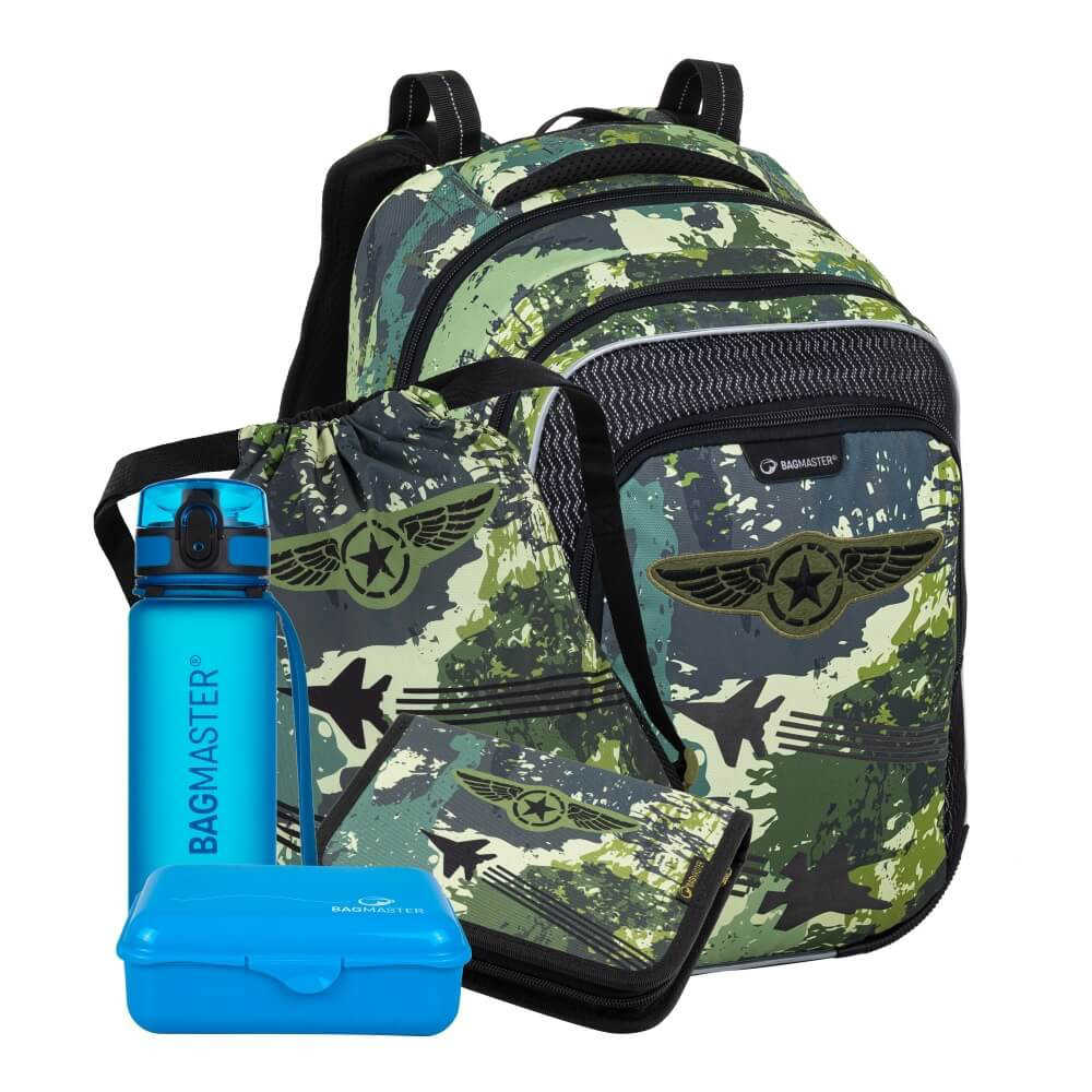 Školní Velký SET se skládá ze 5 produktů značky Bagmaster: Školní batoh, Jednochlopňový školní penál, Školní sáček na přezůvky, Certifikovaná krabička na svačinu, Certifikovaná lahvička na pití