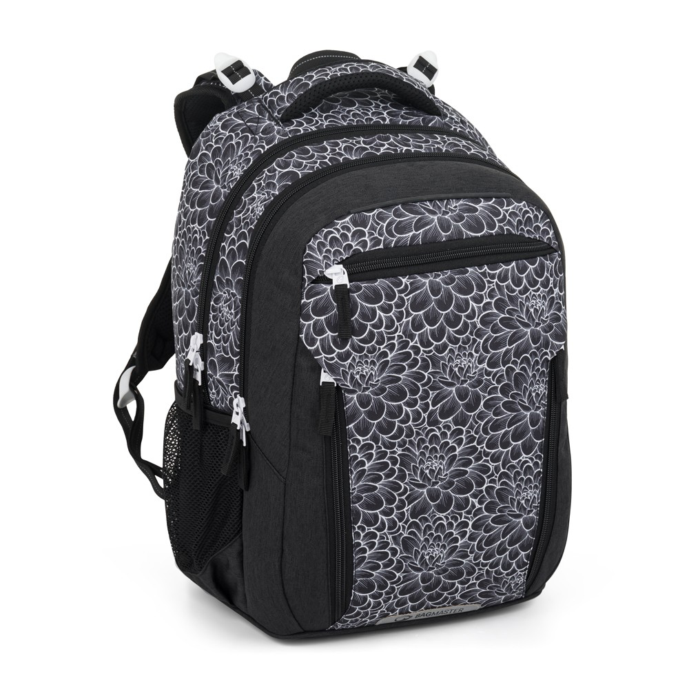 Batoh s elegantním černým designem a jemnými bílými květy má dvě komory pro školní potřeby a dvě přední kapsy na všechny poklady. Díky ergonomicky tvarovaným zádům a pohodlným ramenním popruhům je ideální pro dívky ve 3.–5. třídě, které chtějí být stylové a v pohodlí zároveň. Proč vybrat pro školačku batoh Porto? Je vhodný pro malé slečny především od třetí do páté třídy základky. Je velmi lehký, váží necelý kilogram a tedy zbytečně nezatěžuje záda. Hlavní komora je prostorná. Oddělující kapsa s gumou je připravena na desky a těžké učebnice. Navíc bude díky ní uspořádání tašky přehlednější. I do menší komory se vejdou desky a sešity formátu A4. Zároveň je zde vymakaný organizér: zazipovaná kapsa s otevřeným rožkem na powerbanku, poutko na klíče, kapsička a poutka na mobil, peněženku a tužky. V přední části jsou menší kapsy na drobnosti – jedna horní a dvě boční šité naproti sobě. Ramenní popruhy jsou nastavitelné a, stejně jako zádová část, anatomicky tvarované a měkce polstrované – batoh je pohodlný na zádech v létě i v zimě.