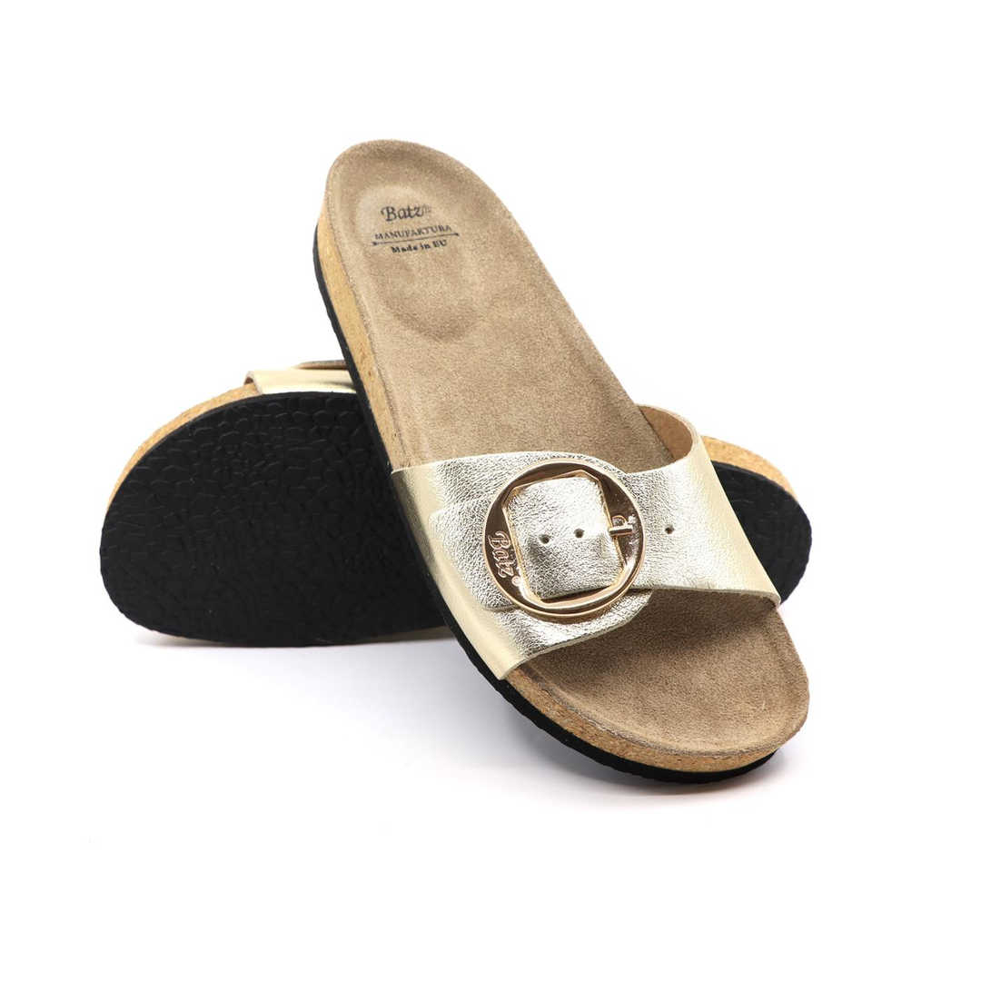 Dámské pantofle Batz. Brilantní, třpytivé pantofle s korkovou podrážkou, která přináší vzrušující jiskru do každodenního léta. Elegantní a lehké, módní a nadčasové. Navíc jsou extra pohodlné díky polštářkům na patě z paměťové pěny a anatomicky navržené struktuře podrážky z pravého korku.