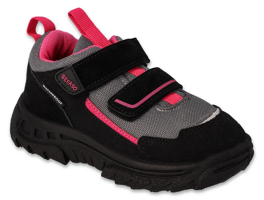 Rádi trávíte čas se svým dítětem turistikou na horské stezce? Nebo možná potřebujete nepromokavou obuv pro vaše dítě, které tráví hodně času venku? Nejnovější model trekových bot Befado je věnován aktivním dětem, které se nebojí dovádění ani v deštivých dnech! Boty jsou voděodolné, lehké, mají dostatečnou přilnavost k zemi a jsou stabilní. Podešev perfektně izoluje chodidlo od země, a proto jsou boty jako stvořené do chladnějších dnů. Vyztužená pata stabilizuje chodidlo a vzdušný materiál, ze kterého je obuv vyrobena, zaručuje volný přístup vzduchu. Trekingové boty Befado TREK WATERPROOF se vyznačují: • voděodolností, díky čemuž boty během lijáků a podzimního deště nepromoknou; • vysoce kvalitním materiálem, který je syntetickou imitaci kůže v kombinaci s prodyšnou síťovinou; • praktickým zapínáním s elastickými pásky a suchým zipem pro snadné obouvaní; • širokou a vysokou špičkou boty; • pružnou, protiskluzovou, lehkou podrážkou PU, která zaručuje bezpečnost při mnoha aktivitách, dokonale izoluje od studené země. Ideální jak pro každodenní procházky, tak pro horské aktivity. Byly vytvořeny s myšlenkou na aktivní děti.