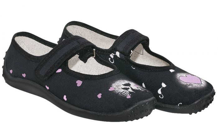 Dětská textilní obuv bighorn JANA se zapínáním na suchý zip a plnou špicí. Materiál je vysoce kvalitní potištěná bavlna v černé barvě s motivem srdce a koček. Lehká pružná podešev vyrobená z PVC. Stélka je vyrobena z přírodní kůže a pružné pěny s aktivním uhlím. Kůže absorbuje přebytečnou vlhkost a aktivní uhlí nepříjemné pachy, což chodidlu dává pocit svěžesti. Pata obuvi je vyztužena. Bota je velice pohodlná a lehká. Vyrobeno v EU.