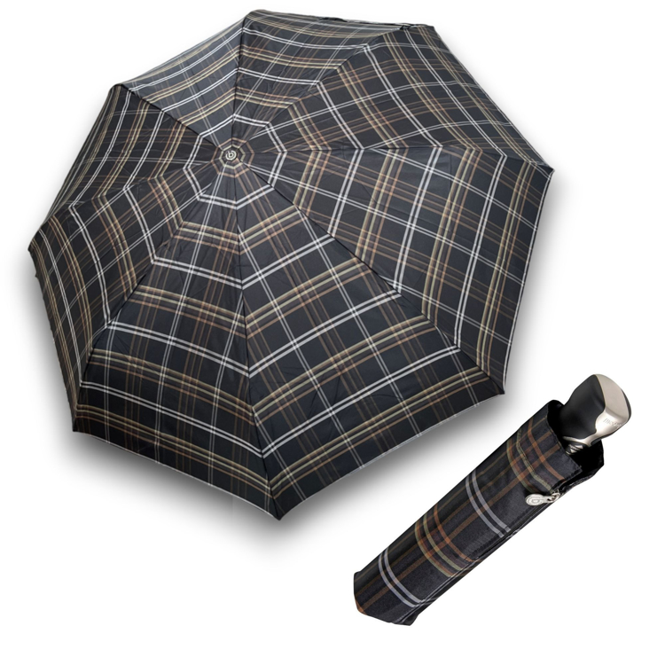 Elegantní pánský plně automatický skládací deštník káro olivové od trendy značky Bugatti. Konstrukce z hliníku a carbonu. Lehká větruodolná konstrukce. Veliká střecha. Polyesterový potah je odolný proti změnám vlhkosti a teplot, nesráží se. S praktickým pouzdrem na zip.