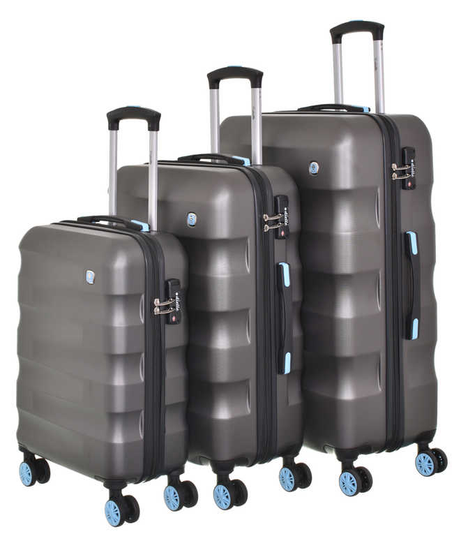 Set 3 ks plastových cestovních kufrů značky Dielle série Wave v antracitové barvě. Moderní design a výborné vlastnosti ve spojení s velmi odolným užitým materiálem jsou přednosti těchto stylových zavazadel. Kufry mají čtyři otočná dvojkolečka díky kterým je cestování velmi pohodlné.