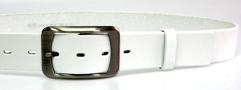 Bílý dámský kožený opasek o šířce 40 mm má zajímavou hranatou lesklou sponu s povrchovou úpravou NKS (nikl satinato). Tato spona obsahuje nikl. Pásek je vyrobený z matné bílé hladké usně. Opasek má zabarvené hrany a upravený rub pásku, což zaručuje, že nedojde k zabarvení oděvu. Pásek není prošitý a lze ho zkrátit pomocí šroubku, který spojuje opasek a kožený díl se sponou.