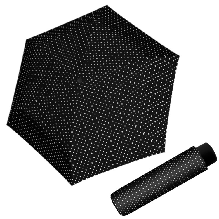 Micro Alu Dots je dámský/dětský skládací deštník s moderním tečkovaným vzorem. Díky své nízké váze (191 gramů) a délce pouhých 18 cm se snadno vejde téměř do každé kabelky a bude tak vítaným společníkem na cesty. Deštník má konstrukci z odolné oceli a sklolaminátu, což mu zajišťuje odolnost a zároveň pružnost ve větru. Potah je vyrobený z látky pongee, která je příjemná na dotek a zároveň mimořádně tenká. Potah je odolný vůči změnám vlhkosti a teplot, nesráží se.