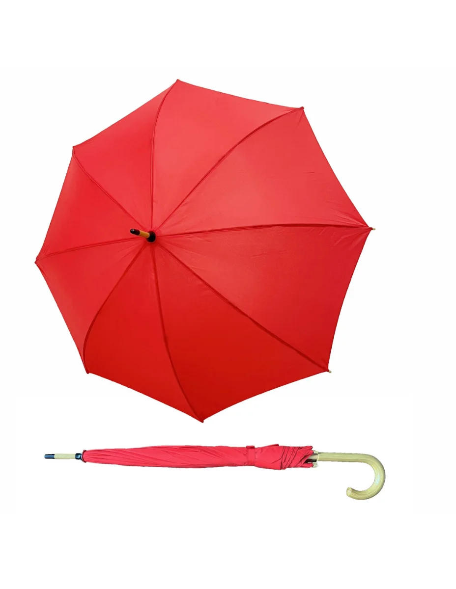 Bern-dřev.hol.d. červený Elegantní holový vystřelovací deštník. Konstrukce je vyrobená ze dřeva a černé oceli. Polyesterový potah je rychloschnoucí, odolný vůči změnám vlhkosti a teplot, nesráží se. Deštník má velkou střechu (průměr 100 cm), díky čemuž se pod ním ukryjí před deštěm i dvě osoby. Informace o produktu: dřevěná ručka a hlavní tyč prostorná střecha dřevěná špička