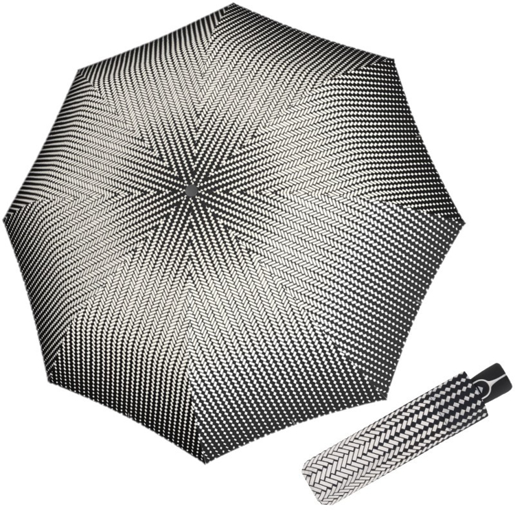 Fiber Magic Black a White Traced - dámský plně automatický deštník Deštník s moderním vzorem, který je dodáván s obalem stejného motivu. Konstrukce deštníku je vyrobena v kombinaci materiálů ocel / sklolaminát a hliník zaručuje pevnost a stabilitu. Odolný proti korozi. Při otočení deštníku nedojde k jeho poškození. 100procent polyesterový potah je odolný proti změnám vlhkosti, teplot a nesráží se. Větruodolný testovaný deštník, který obstál v testu v aerodynamickém tunelu s rychlostí větru až 100 km/h. Upozornění: Plně automatický deštník otevírejte a zavírejte pouze stisknutím tlačítka, jinak hrozí rozbití mechanismu. Informace o produktu: Odolný vůči větru, při převrácení nedojde k poškození deštníku Testováno ve větrném tunelu BMW do 100 km/hod