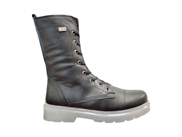 Vyšší kožené dámské kotníkové boty s transparentní podrážkou a metalickým logem.
