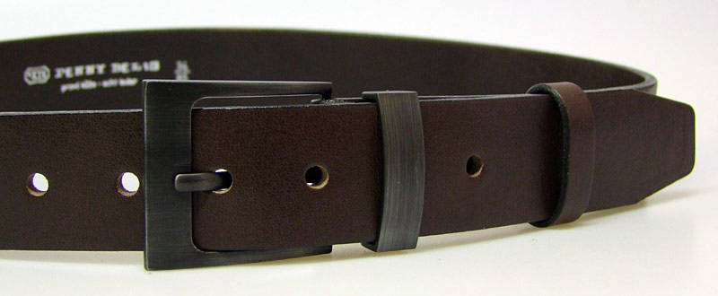Hnědý pánský kožený opasek o šířce 40 mm má výraznější sponu s povrchovou úpravou stíraný zinek. Tato spona neobsahuje nikl. Pásek je vyrobený z tmavě hnědé hladké matné kůže se zcela patrnou strukturou. Opasek má zabarvené hrany a upravený rub pásku, což zaručuje, že nedojde k zabarvení oděvu. Pásek není prošitý a lze ho zkrátit pomocí šroubku, který spojuje opasek a kožený díl se sponou.