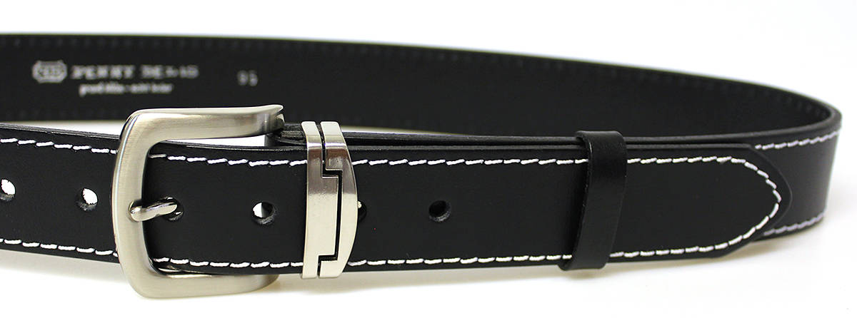 Černý pánský kožený opasek o šířce 40 mm má výraznější sponu s povrchovou úpravou NKS (nikl satinato). Tato spona obsahuje nikl. Pásek je vyrobený z černé usně, která je prošitá kontrastní bílou nití. Opasek má zabarvené hrany a upravený rub pásku, což zaručuje, že nedojde k zabarvení oděvu. Pásek lze zkrátit pomocí šroubku, který spojuje opasek a kožený díl se sponou. Prvotřídní kvalita od českého výrobce.