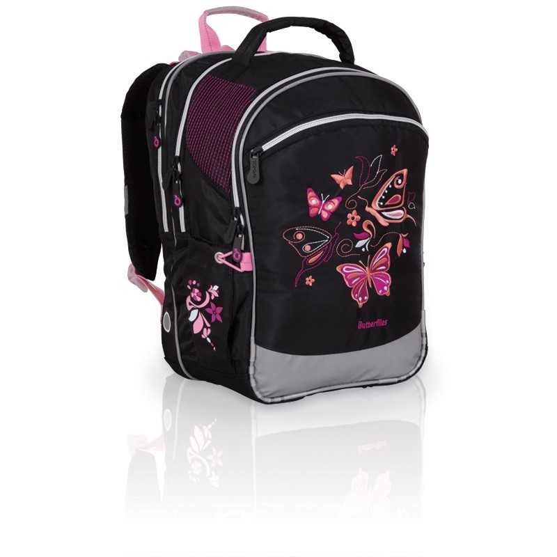 Exkluzivní tříkomorový školní batoh s motýlky, pro školačky 1. až 5. třídy.