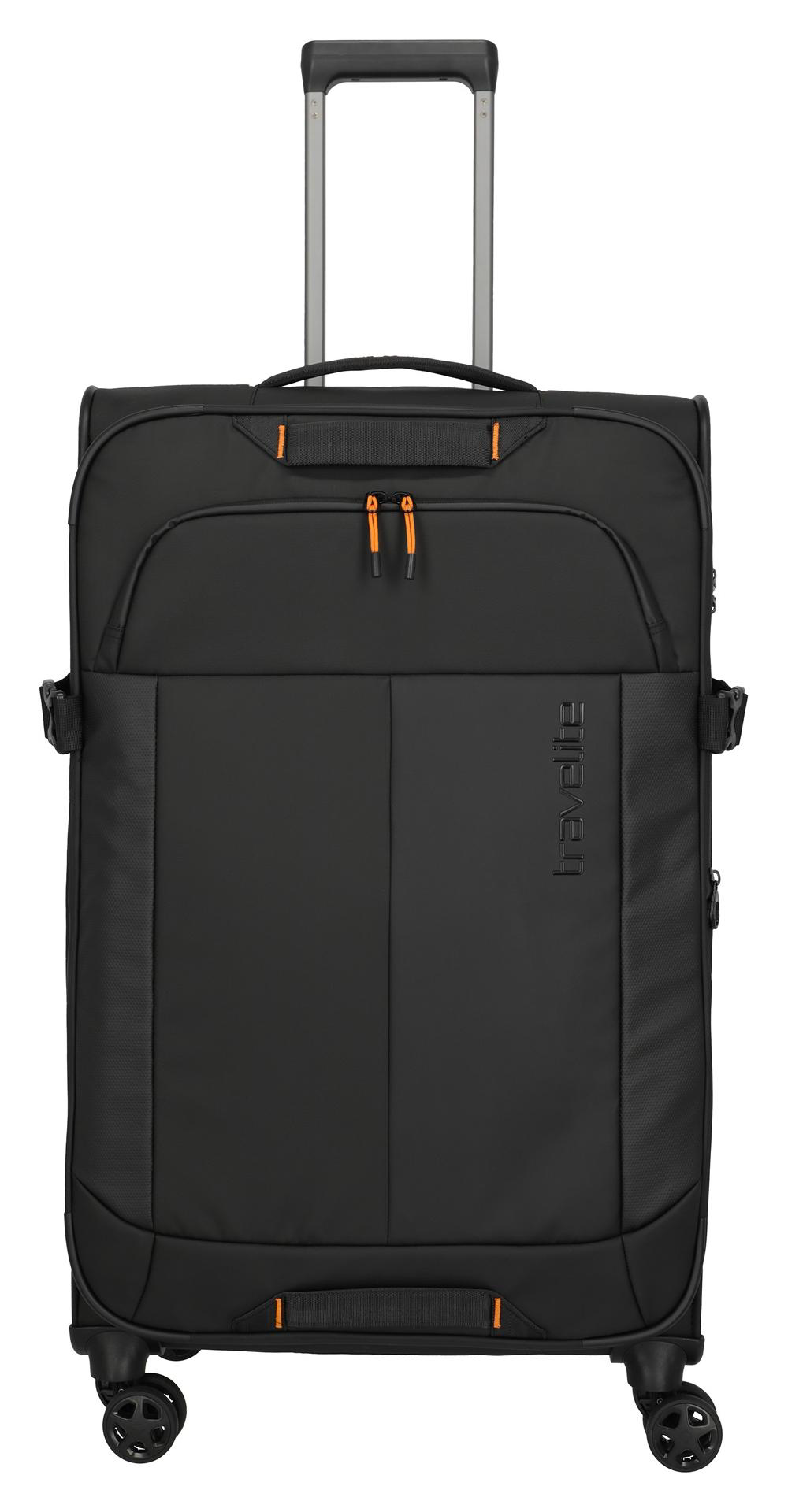 Velký látkový kufr na čtyřech kolečkách s integrovaným TSA zámkem, expandérem, přední kapsou a vodoodpudivými zipy vyrobený z tarpaulinu.