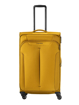 Textilní cestovní kufr na čtyřech kolečkách vybavený integrovaným TSA zámkem, expandérem a přední kapsou na zip.