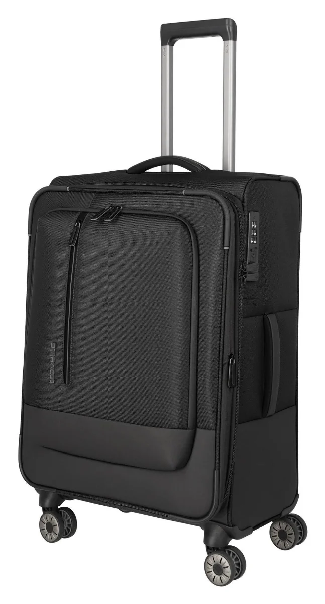 Čtyřkolečkový střední textilní kufr z recyklovaného polyesteru s vodoodpudivým dnem, TSA zámkem, expandérem, kapsou na notebook a integrovanou jmenovkou.