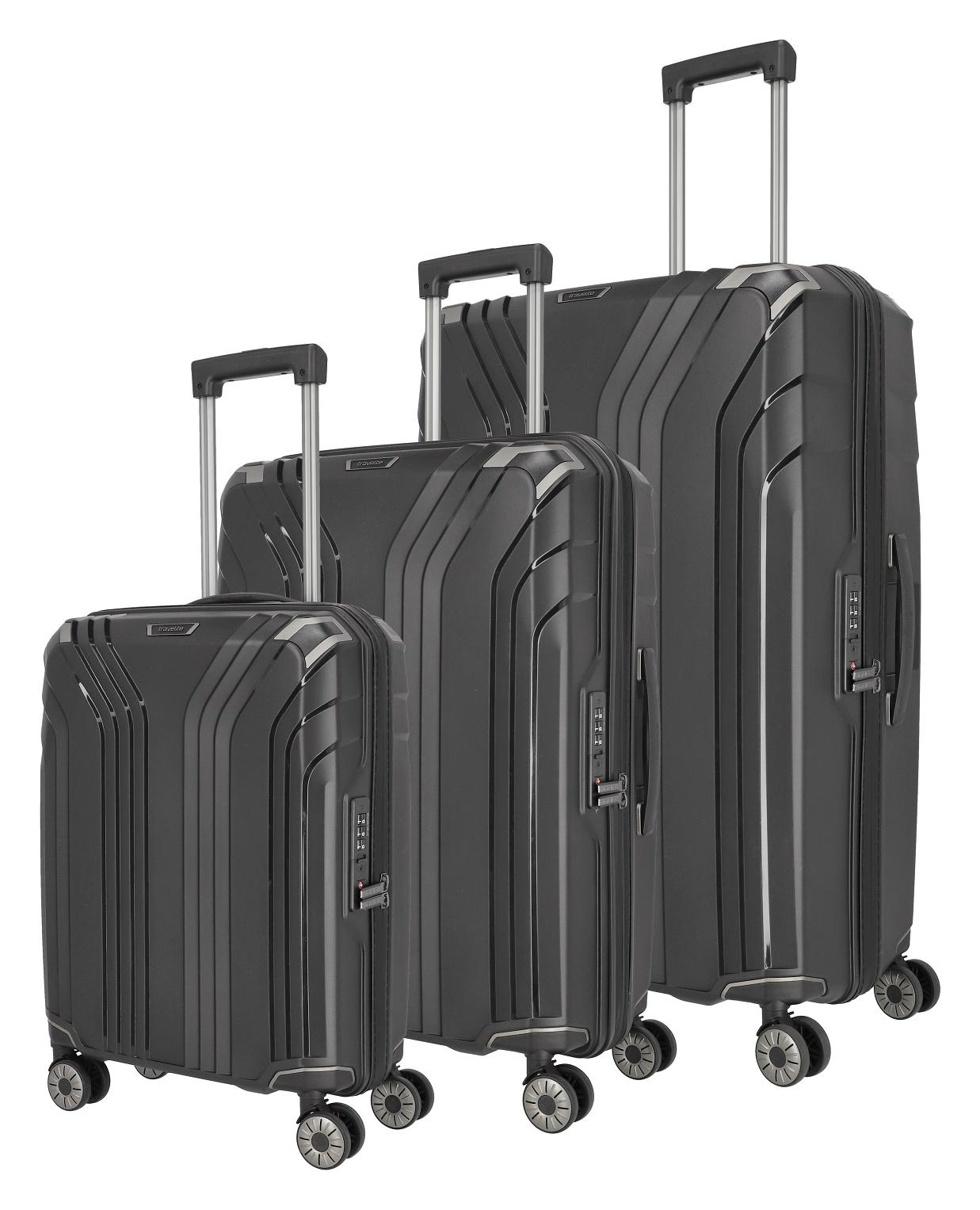 Sada luxusních skořepinových kufrů na čtyřech kolečkách s voděodolným zipem a exkluzivním TSA zámkem vyrobená z extrémně odolného polypropylenu.