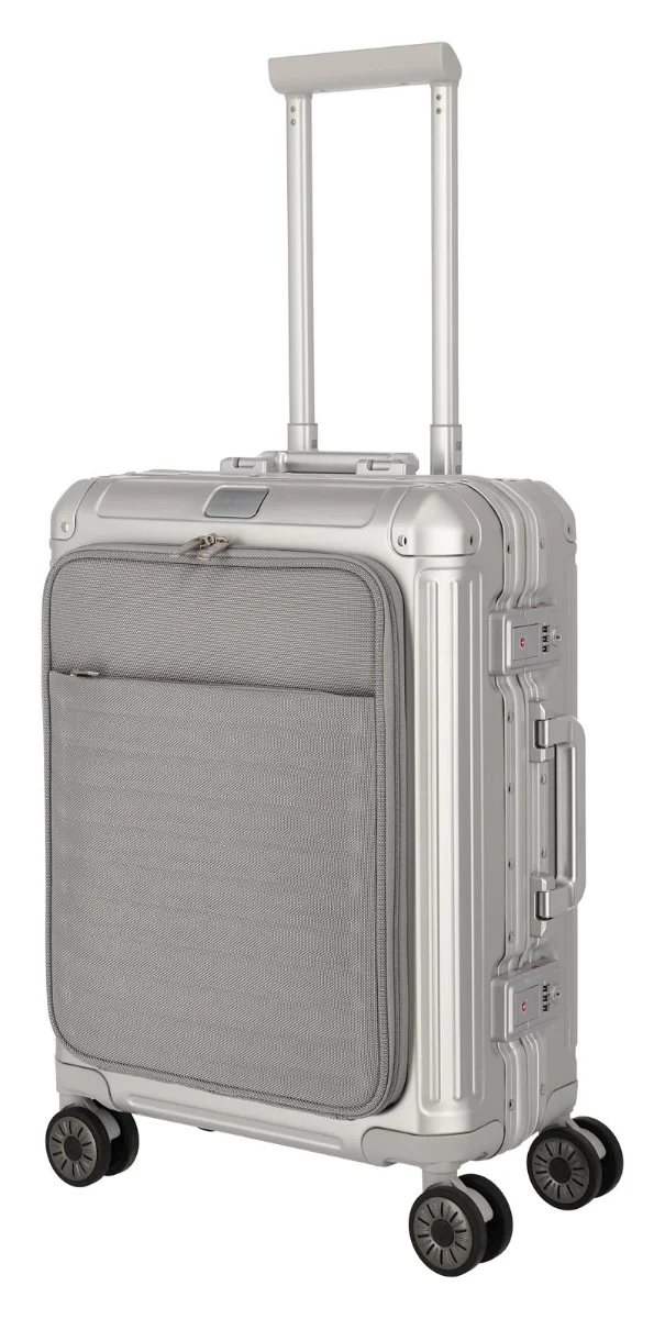 Extra odolný čtyřkolečkový hliníkový rámový palubní kufr se zavíráním na klapky Click-lock s integrovanými TSA zámky a textilní přední kapsou na notebook.