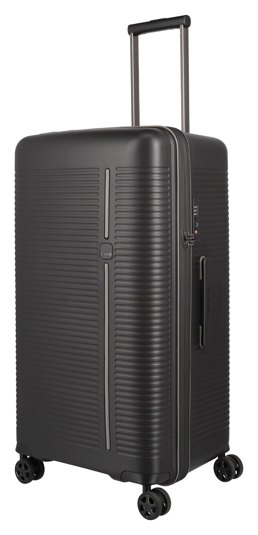 Velký skořepinový kufr na čtyřech kolečkách z nárazuvzdorného polypropylenu v inovativním designu s hlubší zadní částí, vybavený integrovaným TSA zámkem.