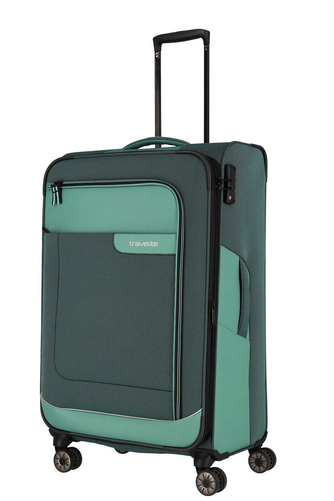 Textilní kufr na čtyřech kolečkách s integrovaným TSA zámkem a expandérem vyrobený z recyklovaného polyesteru.