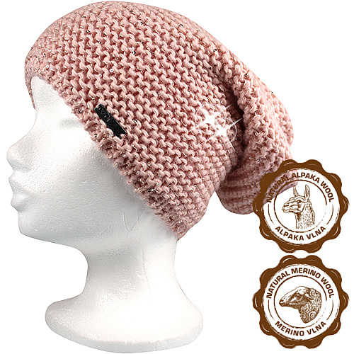 - dámská pletená čepice z vlny alpaky (ze srsti jihoamerických velbloudovitých zvířat) a merino vlny zdobená flitry, vnitřní strana mikrofleece