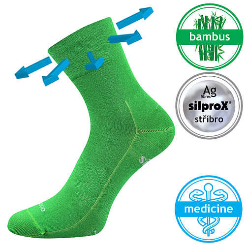 - dámské-pánské sportovní ponožky, extra vyztužené chodidlo proti opotřebení, speciální - extra volný nestahující lem, řetízkovaná špice, materiál bambus s přirozenou antibakteriální ochranou, antibakteriální ochrana ionty stříbra v materiálu silproX, teplotní třída: A